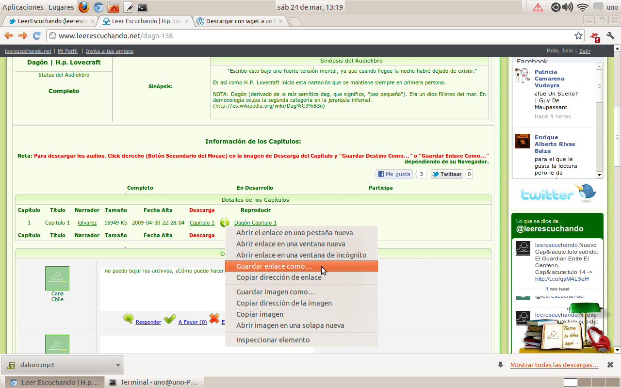 Para descargarte los ficheros .mp3, os tenéis que registraros, luego una vez que entréis con vuestro usuario, cuando entréis en un audiolibro veréis un nuevo icono junto al lado de los capítulos...