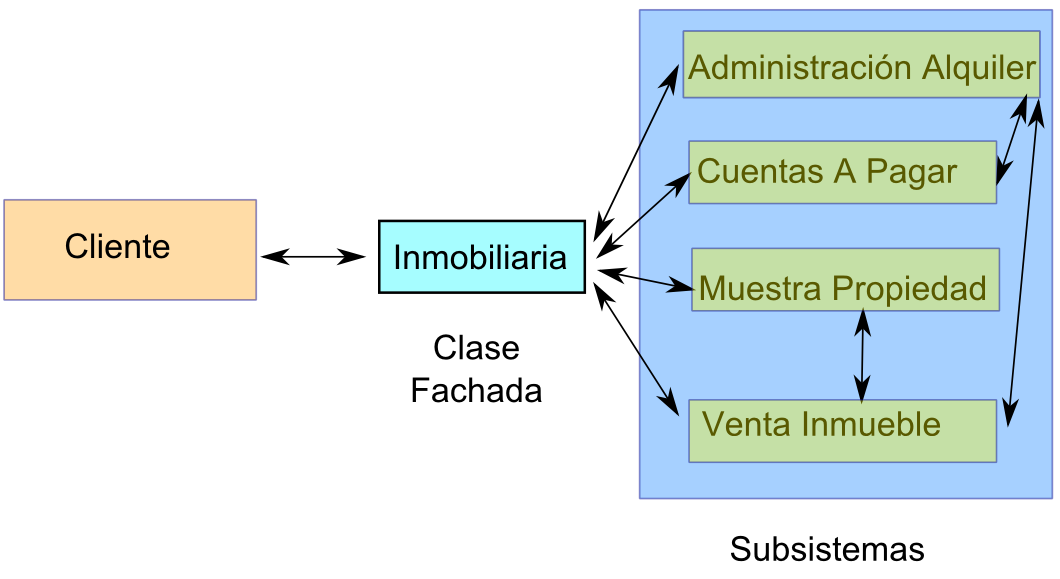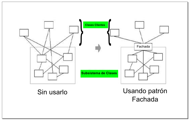 Este patrón busca reducir al mínimo la comunicación y dependencias entre subsistemas. Para ello, utilizaremos una fachada, simplificando la complejidad al cliente. El cliente debería acceder a un subsistema a través del Facade. De esta manera, se estructura un entorno de programación más sencillo, al menos desde el punto de vista del cliente (por ello se llama "fachada").Ref: http://migranitodejava.blogspot.com.es/2011/06/facade.html