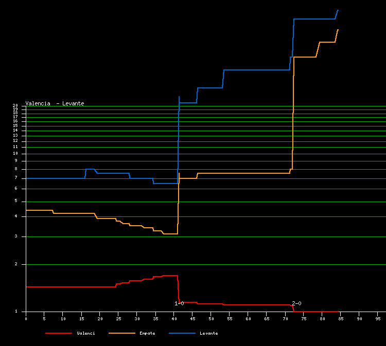 | Evolución de cuotas del Valencia - Levante resultado: ( 2 - 0 ) cuotas iniciales: 1: 1.50 X: 4.00 2: 7.00 |