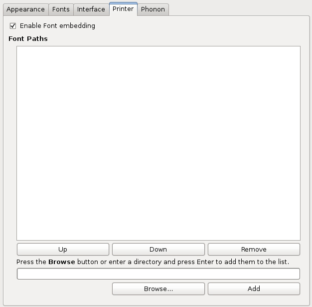 Utilice esta ficha para configurar la forma en Qt genera una salida para la impresora. Puede especificar si Qt debe tratar de incorporar fuentes en su salida generada . Si habilita la incrustación de fuentes , la posdata resultante será más portátil y reflejar con mayor precisión la salida visual en la pantalla ; sin embargo, el tamaño del archivo PostScript resultante será más grande.